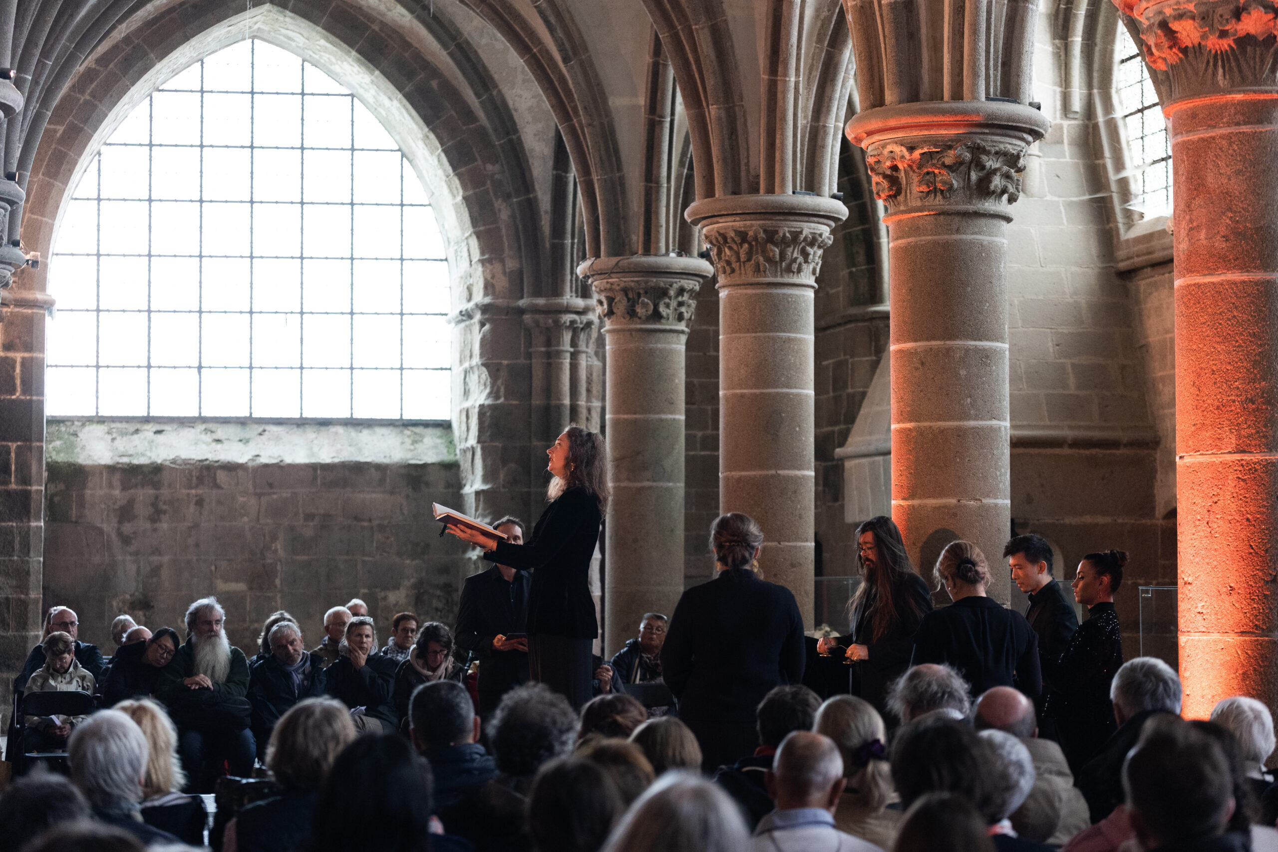Dans les Chants de la Terre, ce « pur moment de nature » est diffusé par des panneaux acoustiques au son exceptionnel de Diptyque Audio. Ils génèrent une immersion complète du public dans ce paysage sonore vivant, auquel s’ajoutent les voix des 8 chanteurs spatialisés, entrant dans la conversation de la nature sauvage. C’est donc un spectacle très instinctif pour le public : il y est en connexion sensorielle, et non réfléchie, avec la nature et le vivant. Les œuvres vocales, dont les textes suivent comme dans un grand Requiem, le chemin vers la mort, l’acceptation puis l’espérance et le surgissement d’une vie nouvelle, dialoguent aussi entre deux époques qui s’interrogent sur notre place dans l’univers : la Renaissance avec Lobo et Victoria, et notre époque avec Bertrand Richou, compositeur talentueux qui écrit ici sur des textes de St François d’Assise et Baudelaire.